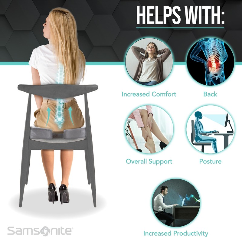 - HIGH-GRADE MEMORY FOAM - This seat cushion from Samsonite is stuffed with the best memory foam on the market. This foam reacts immediately to the precise shapes and curvatures of your body to offer lower back and upper leg support customized just for you. It remembers the shape of your body, so you can rely on it to adjust right back to the perfect form for you the moment you start using it.