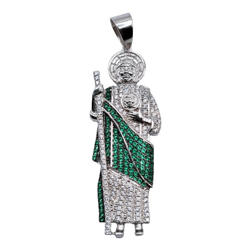 San Judas Pendant with Sparkling White and Green Cubic Zirconia Stones.