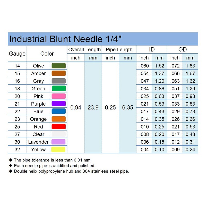Blunt needle precision stainless steel,Length of 0.25 inch.