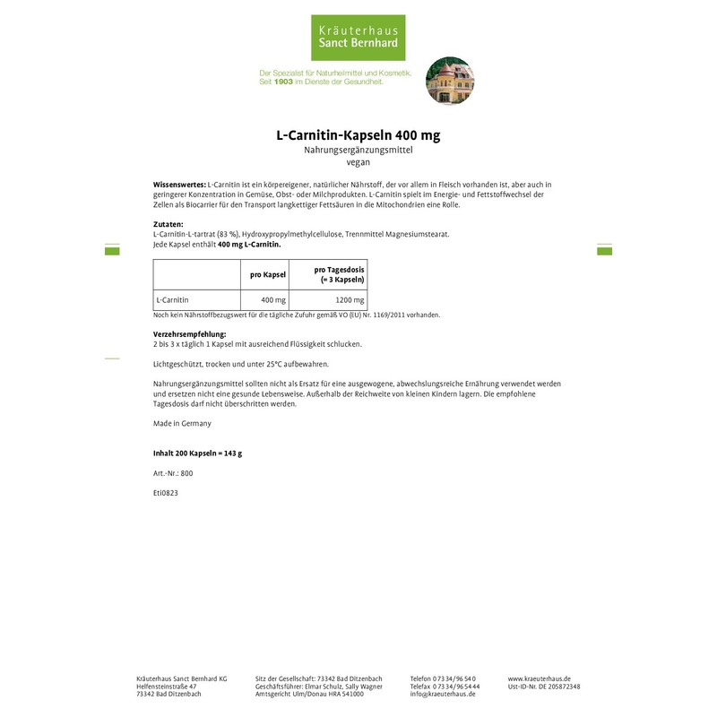Sanct Bernhard L-Carnitine Capsules, 400 mg Pure L-Carnitine, 200 Capsules