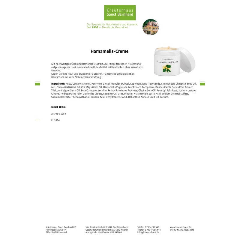 Sanct Bernhard Witch Hazel Cream with High Quality Oils and Witch Hazel Extract 100 ml