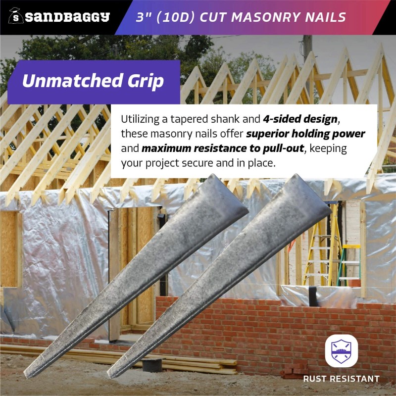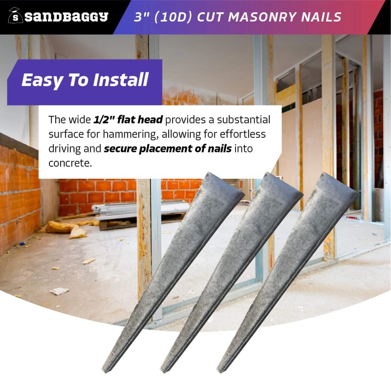 - Heat-Treated for Extra Strength: Sandbaggy cut 3 inch concrete nails are crafted from 10-gauge tempered steel for unmatched resistance to bending when used on hardwood or masonry surfaces. The tempering process ensures the nail's strength and ability to withstand challenging tasks.