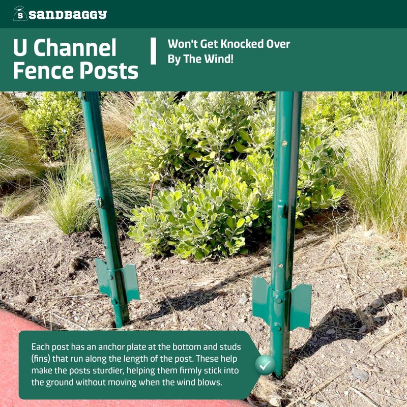 Sandbaggy U Channel Posts for Fences & Signs - Studded Steel, Green Garden Stakes - (Pack of 5, 3 ft Length)