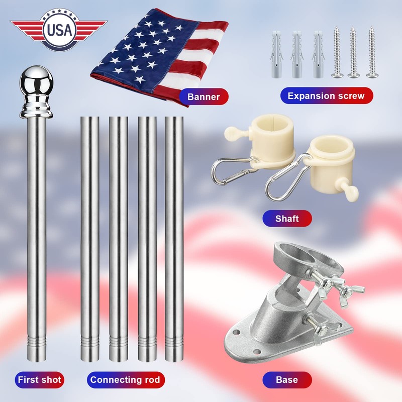 - Flag Pole Kit With American Flag-The package is complete with premium 3x5 ft American Flag,stainless steel flag pole,aluminum alloy bracket, two tangle-free ring clips,and mounting hardware,Great Decoration for your house roof,porch,garage.