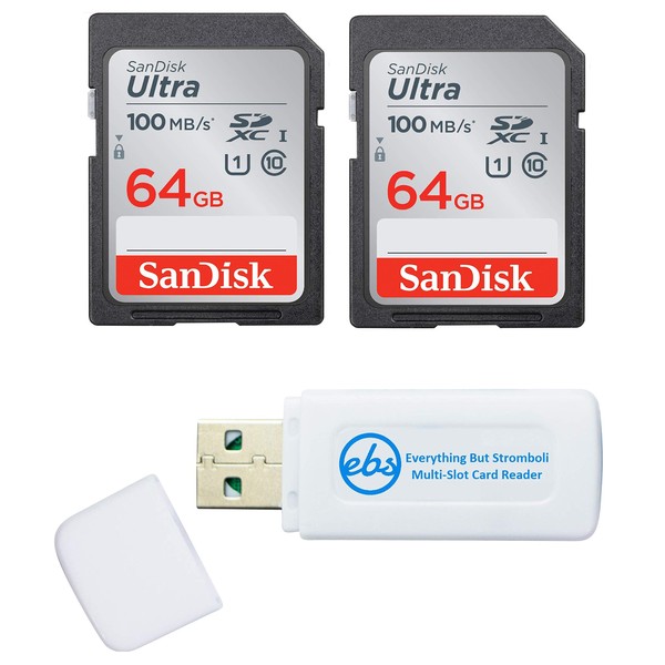 SanDisk 64GB Ultra Memory Card (2 Pack) UHS-I Class 10 SD (SDSDUNR-064G-GN6IN) - Bundle with (1) Everything But Stromboli Combo Card Reader