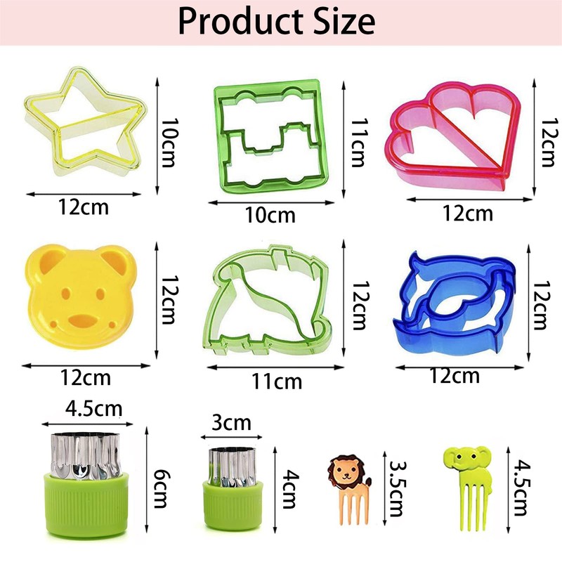 - All-Inclusive Cooking Tool :The most popular Shapes in 1 Set: 6 Sandwich Cutters Shapes – Dinosaur, Star, Heart, Train, Dolphin,Panda; 12 Fruit Cutters – Star, Heart, Flower, Rabbit, Mouse; BONUS 10 Food Picks – Elephant, Panda, Rabbit, Lion, Giraffe.