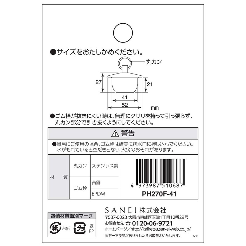 SANEI PH270F-41 Rubber Stopper, TOTO Baths, Brim, No Chain
