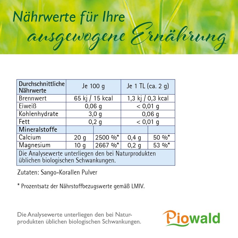 - PIOWALD Quality – branded product: Piowald Sango Vital – 100% Sango sea coral powder from Okinawa. Natural source of calcium (20%) and magnesium (10%) in the body's own ratio of 2:1.