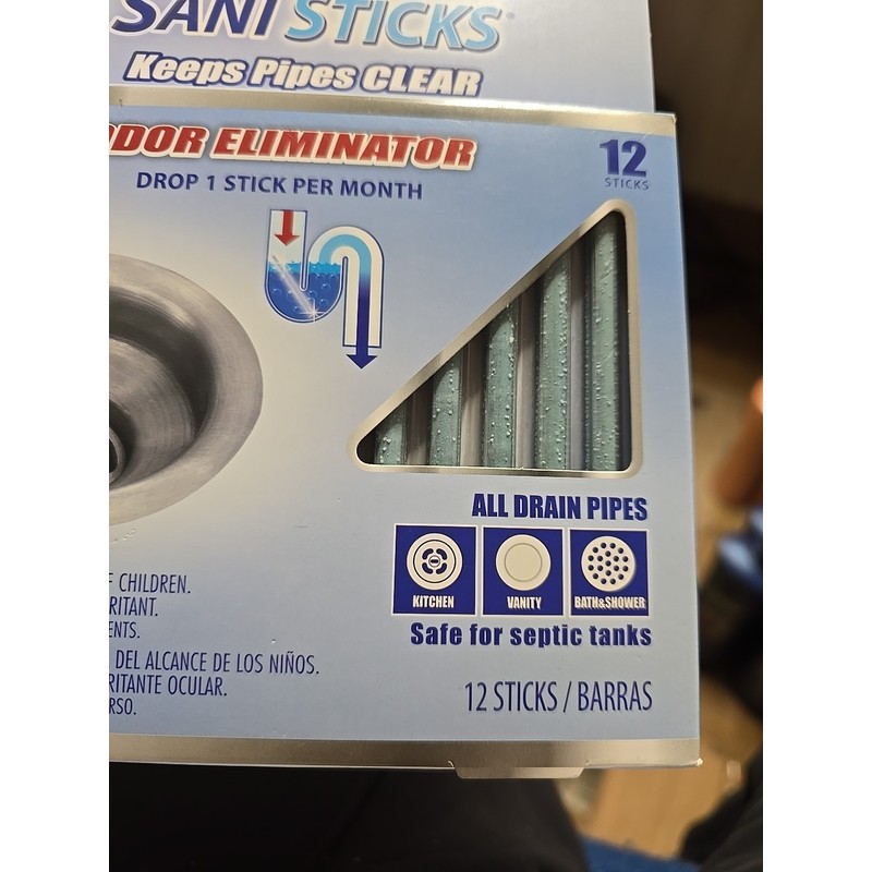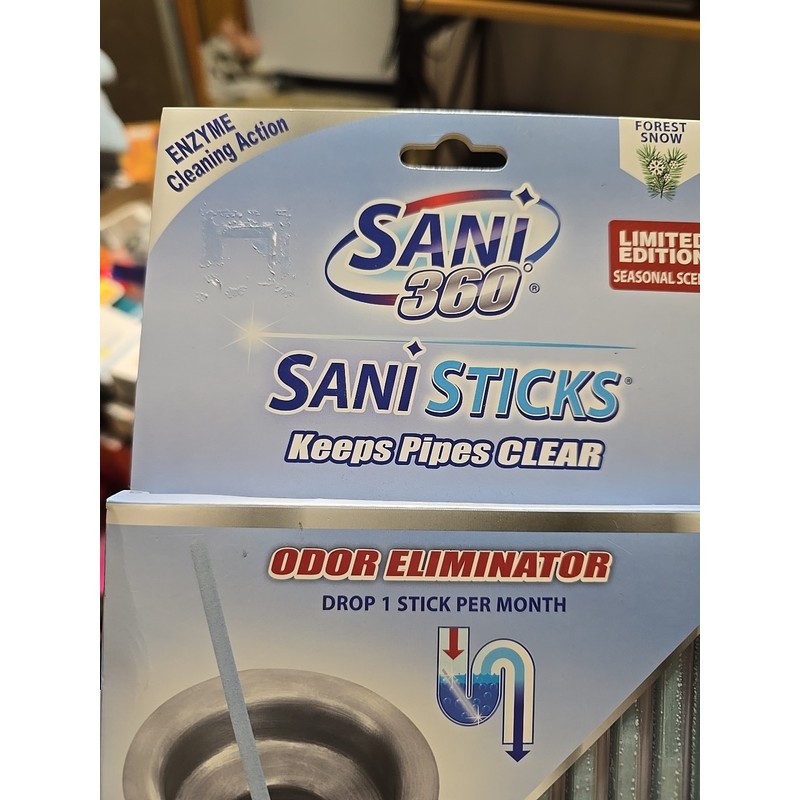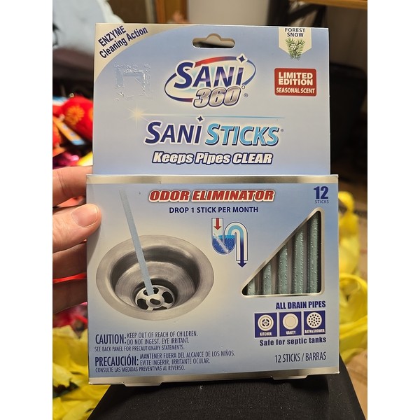 The Sani 360 Sani Sticks in Forest Snow scent come in a pack of 12 sticks. These odor eliminators are designed for drains and have a capacity of 30 days. The sticks are in a stick form and are safe for septic systems. The scent is a limited edition Forest Snow fragrance, and the product is made in China.