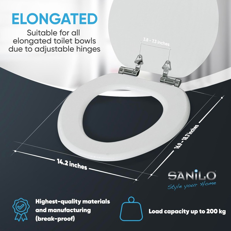 • FULLY ADJUSTABLE: Hinges are adjustable from 16.9 to 18.7 inches to adapt to all manufacturer's elongated toilets.