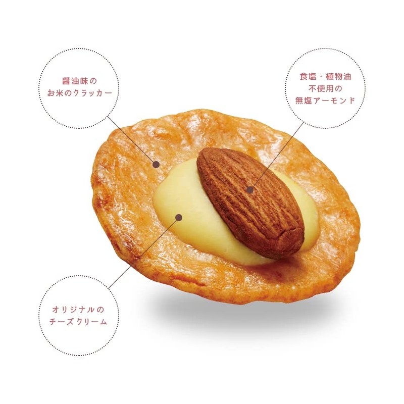 - Since its launch in 1985, Cheese Almonds have been loved by everyone for over 35 years. A crispy rice cracker topped with mellow cheese and unsalted almonds. A rice cracker that allows you to enjoy the exquisite taste of three combinations. The gentle taste allows you to enjoy the taste of the ingredients, and can be enjoyed in a variety of situations, such as snacks, tea snacks, and appetizers. Comes in an easy-to-eat individually wrapped package.