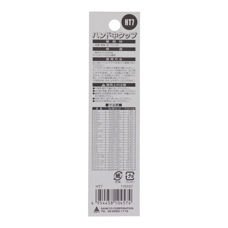 Sankyo Corporation TONEX Hand Tap, Screw Diameter 0.3 inch (7.0 mm) x Pitch, 0.04 inch (1.0 mm) HT7