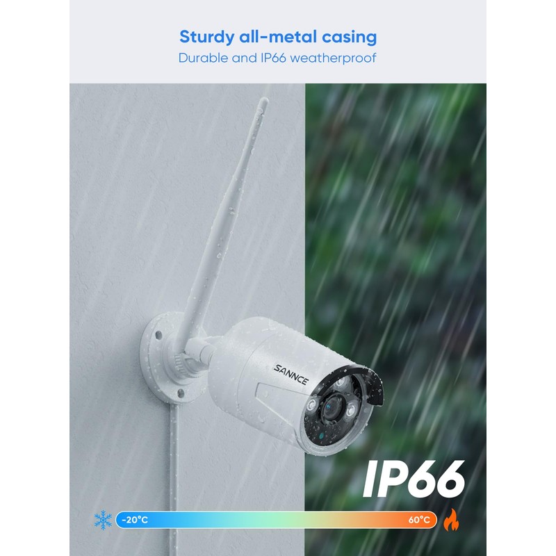 - 【Brave All Weather with IP66 Waterproof】The IP66 waterproof rating ensures the wireless IP security camera withstands extreme weather (-20° to 60°). The weather will no longer become your concern. Place the metal housing WiFi CCTV video cameras wherever, outdoor or indoor, for all-year-round protection.