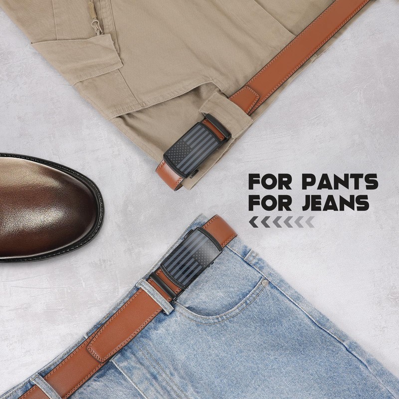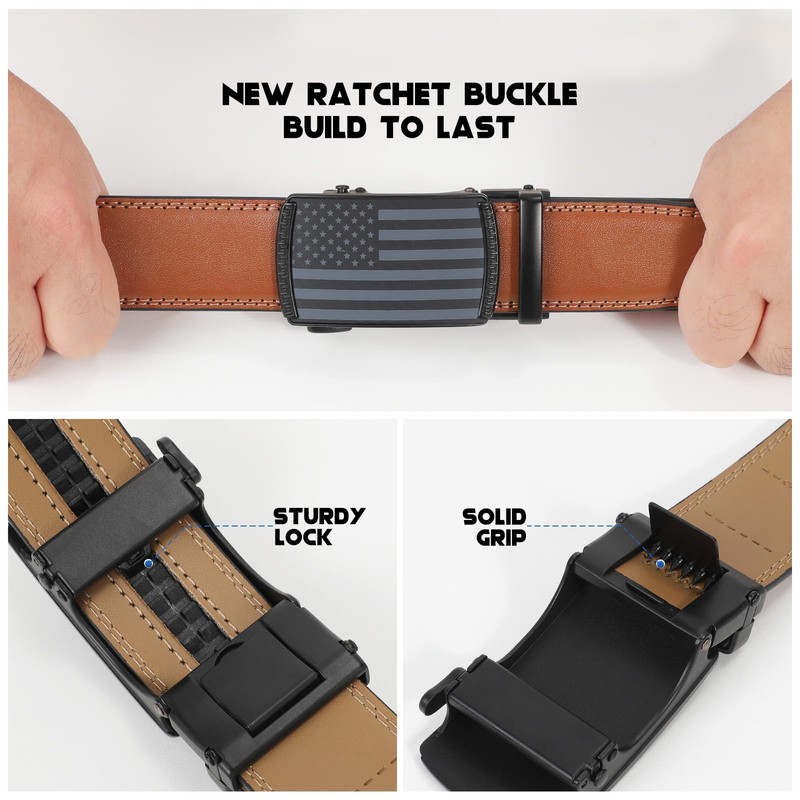 - [EASY USE RATCHET BUCKLE ] To use this mens dress belt, just slide the leather belt tail into the ratcheting slide buckle, it locks automatically. To release the click buckle by simply pushing the buckle latch, it is easy to take off.