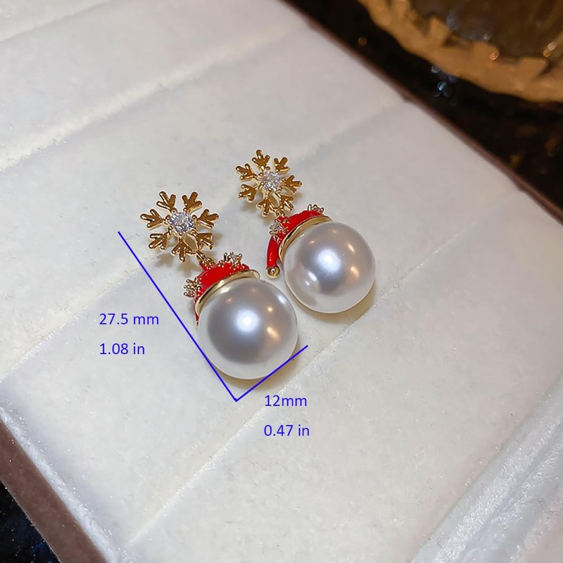 - Size & Details --- Dainty Santa Shell Pearl Snowflake Dangle Earrings, CZ Crystal 12mm Pearls Ball Snowman Charms Drop Dangling Studs.