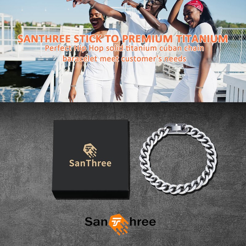 SanThree 9.5mm Solid Titanium Cuban Link Chain Bracelet for Men, Lightweight Skin-Friendly Hip Hop Bracelet with Gift Box, 7.48 Inch