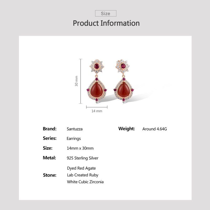 Santuzza 925 Sterling Silver Pear Shape Dyed Red Agate Earrings Created Ruby Cubic Zirconia Stud Earrings for Women