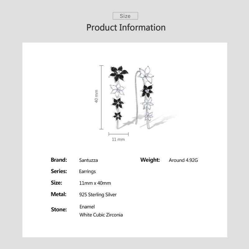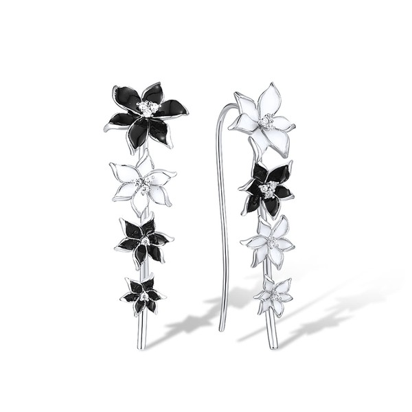 Santuzza Enamel Black & White Flower Ear Cuffs Climber Earrings Sterling Silver Orchid Ear Crawler Earrings for Women