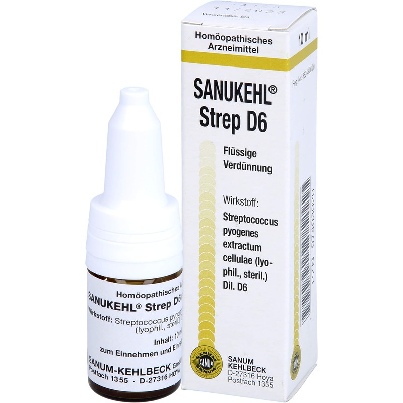 Sanukehl Strep D6 Flüssige Verdünnung. Wirkstoff: Streptococcus pyogenes extractum cellulae (lyophil., steril.) Dil. D6. Anwendungsgebiete: Registriertes homöopathisches Arzneimittel, daher ohne Angabe einer therapeutischen Indikation.