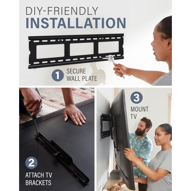 - Hassle-Free Install: For an easy DIY experience, this TV bracket comes preassembled and includes all the hardware needed to get the job done in just 30 minutes. For safety, this mount locks into place for a secure finish. Need to access your cables? Hidden pull straps make it safe and easy to plug in your devices.
