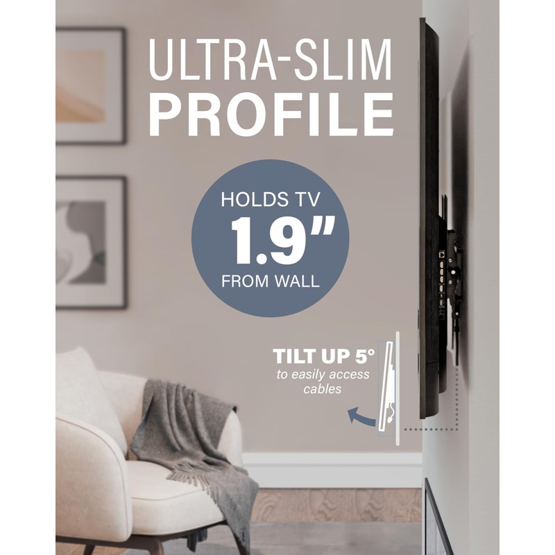 - Sleek & Space Saving: This low profile TV mount sits your screen just 1.9" from the wall, creating a flush profile for a minimalistic look, allowing you to enjoy a clutter-free setup while maximizing on your TVs view.