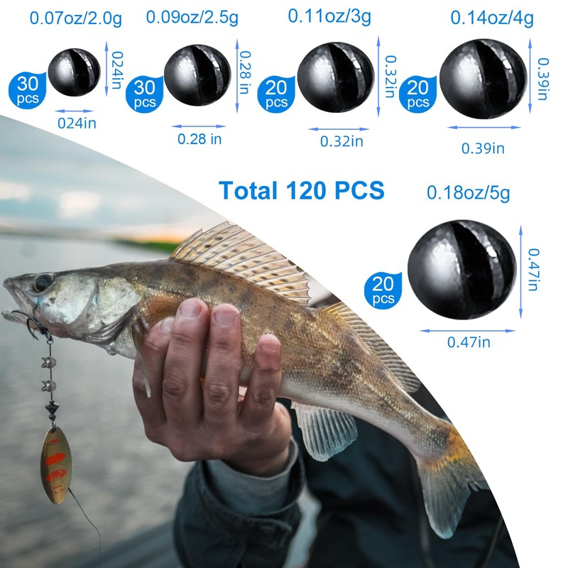 - Large Size: Our round sinkers are fully upgraded and enlarged for better fishing. Each package includes 120 pcs in 5 different sizes of fishing weights, 0.07OZ 30PCS, 0.09OZ 30PCS, 0.11OZ 20PCS,0.14OZ 20PCS, 0.18OZ 20PCS.