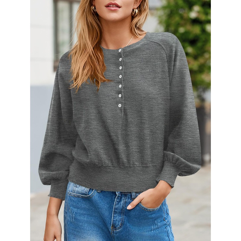 Saodimallsu Womens Button Crew Neck Sweater Fall Long Sleeve Henley Shirts Trendy Loose Knit Pullover Tops Grey