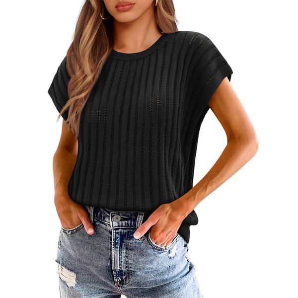 Saodimallsu Womens Summer Crochet Sweater Vest Cap Sleeve Knit Tops Casual Crewneck Sleeveless Sweaters Black
