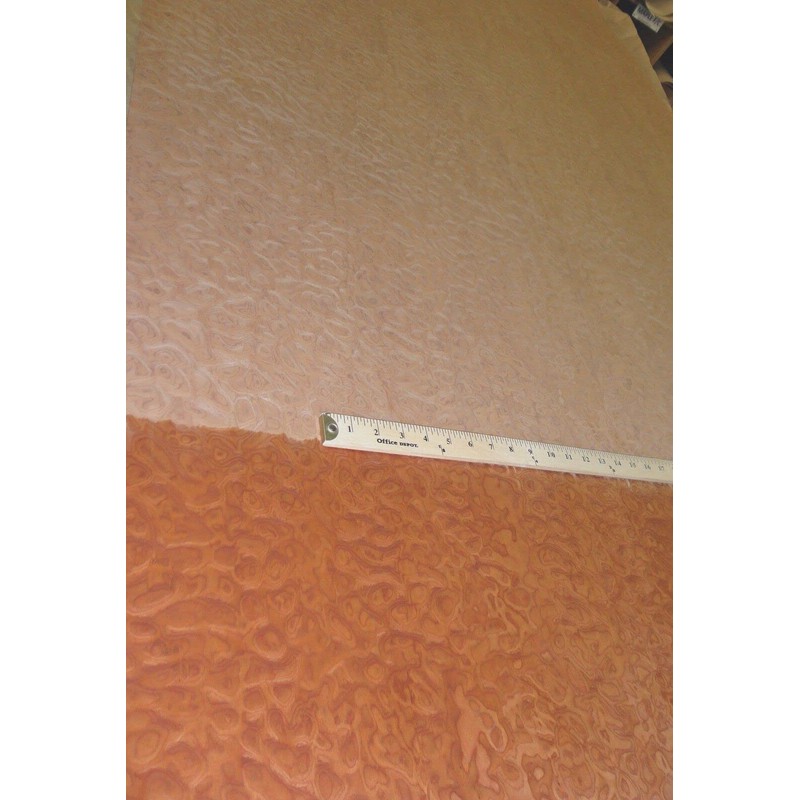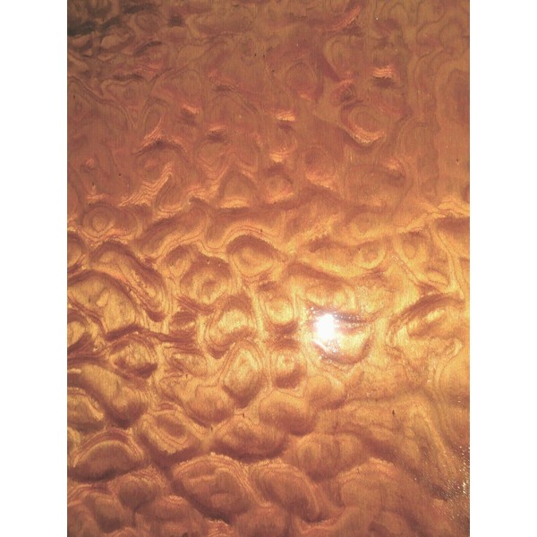 Not quite as orange as photos, some browner. Composite is made of real wood and is dyed and cut to make the sheets consistent and clean without natural defects or markings that would be in a natural wood veneer. Finishes and laminates similar to any other veneer. High quality product. Some photos may show other sizes, customer projects and wet or finished veneer. Product is unfinished. Other sizes and backed veneer are available. Faster is available. This product may have some minor cracking that is part of the figure in the wood. Expect reasonable. Ships rolled in small box. No true grain direction.