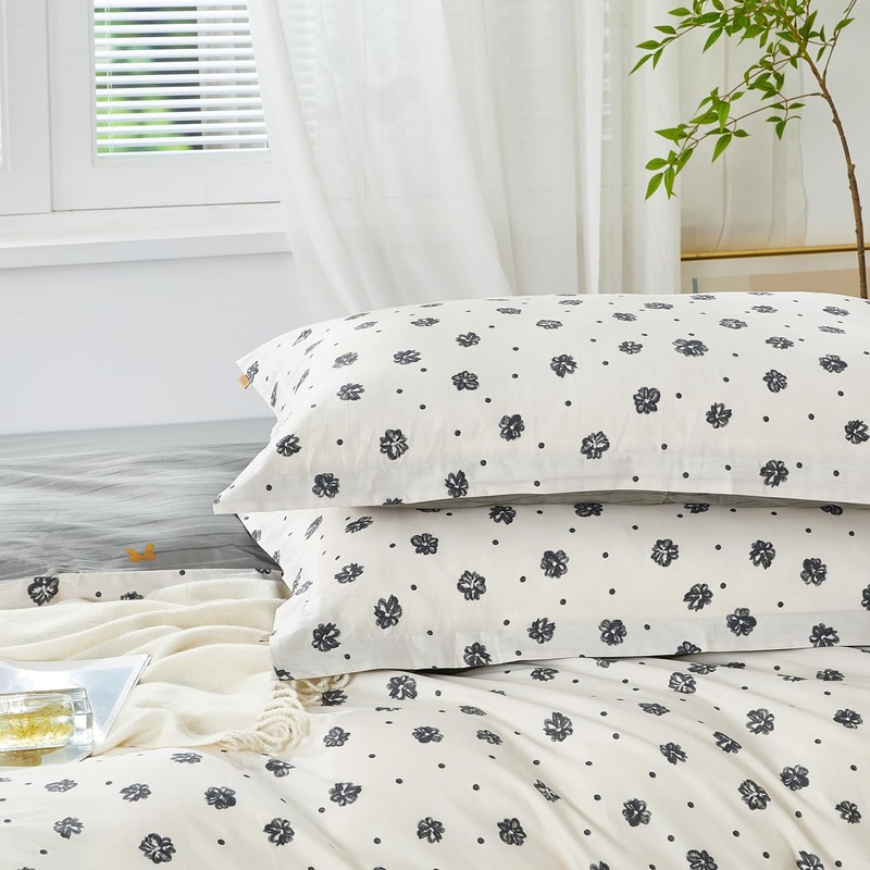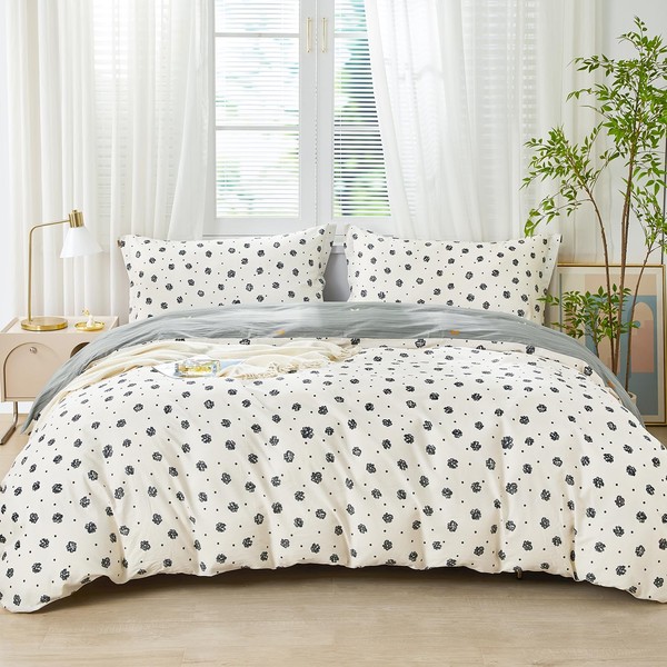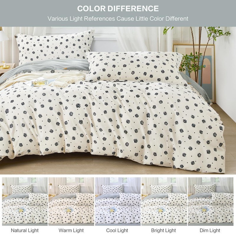 - 【Elegant Floral Design】: This SAPHREAS cotton duvet cover set has a cream base with small dark blue and black floral patterns, simple and elegant. The soft flower design creates a cozy, modern vibe, and the light grey throw adds contrast, completing the look.