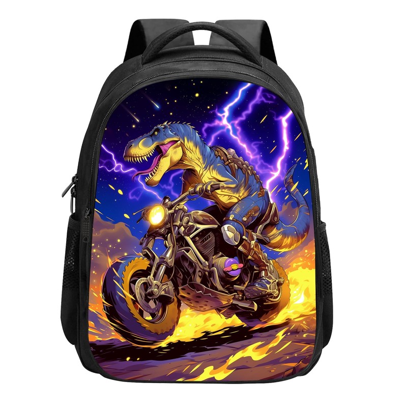SARA NELL Dinosaur Backpack Boys Dinosaur Ride Motorcycle Backpack, Cool Dinosaur with Purple Lightning in Galaxy Space Anime Style Backpack, Elementary Boys Backpack with 2 Compartments, 16 Inch