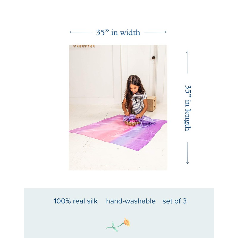 - Set of 3 - This set of Playsilks includes our Blossom, Lavender, and Pink colors, all of which measure 35" x 35".