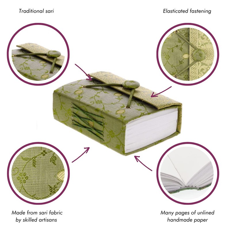 - Our beautiful collection of Fair Trade mini sari journals will add a joyous burst of colour to your writing.