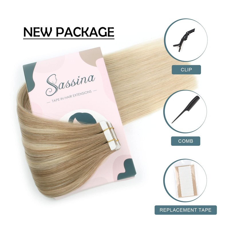 Sassina 35 cm Tape-In Human Hair Extensions, 50 g, Invisible, Reusable Tape-In Extensions in Dirty Blonde Mixed with Bleach Blonde, 20 Pieces, #B8-60