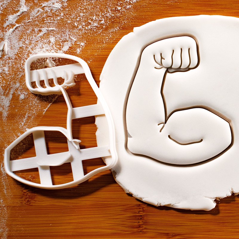 - Bent biceps cookie cutter size: 8.3 cm by 10.0 cm (3.2 inches by 3.9 inches)
