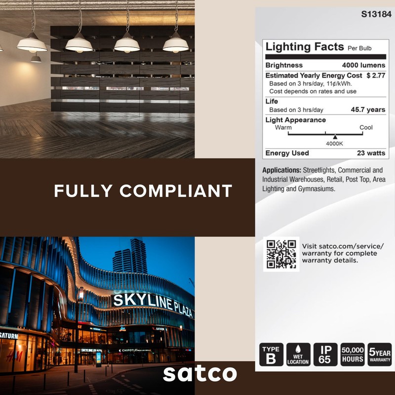 Satco S13184 23W LED HID Replacement Bulb, ED23.5 Clear, 4000K Cool White, E26 Base, 4000 Lumens, Ballast Bypass, 120-277V, IP65 Rated – Enclosed Fixture Safe for Outdoor Use