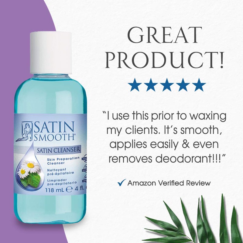 - PRE DEPILATORY ANTISEPTIC CLEANSER: Here’s Satin Smooth Satin Cleanser Skin Preparation Cleanser for a hygienic and comfortable waxing experience! This pre-waxing cleanser helps prep the skin and prep hairs up for better hair removal. Perfect for all skin types, its special formula gently removes dirt, makeup, and perspiration while helping diminish irritation-causing bacteria. Promising a clean, smooth and nourished complexion, this cleanser is the perfect first step in any waxing ritual!