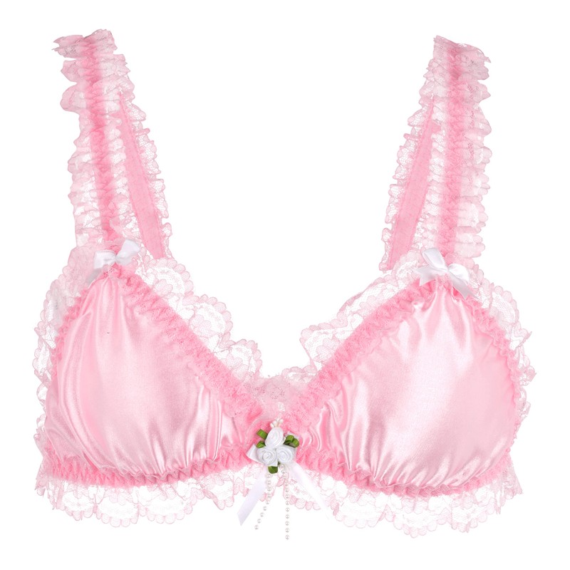 Satini Sissy Frilly Lace Fitted Satin Bralette (Baby Pink, L)