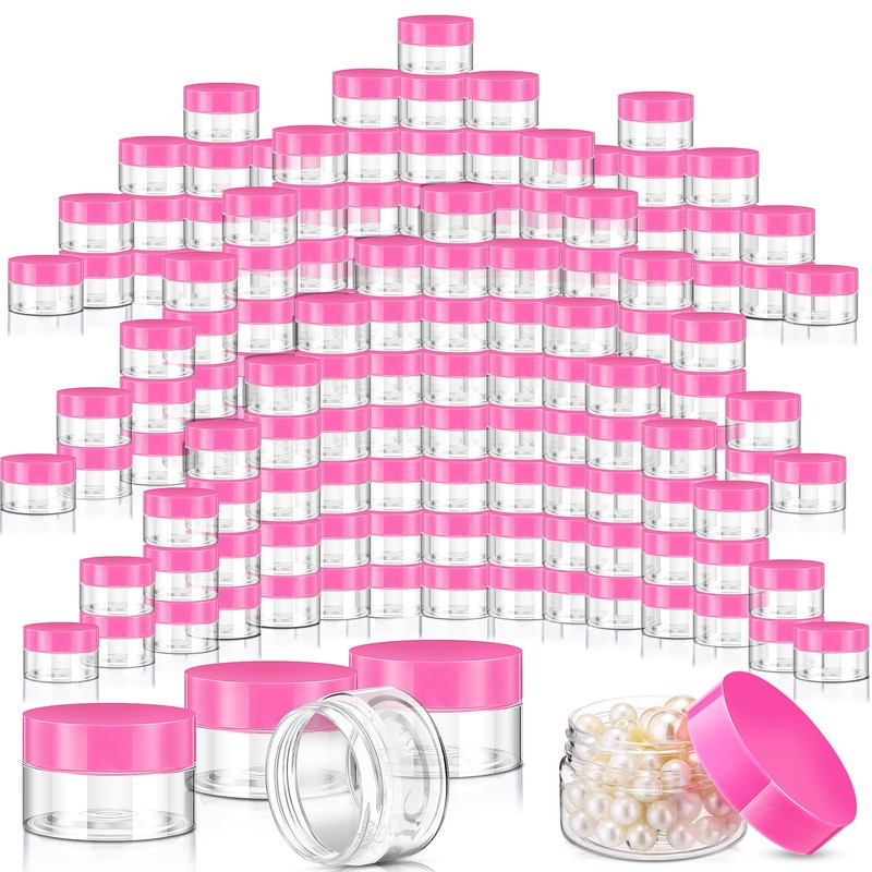 SATINIOR 100 Pcs Plastic Jars with Lids Small Containers with Lids Wide Mouth Small Plastic Containers for Lotion Cream Rhinestones Body Butters Travel Storage(Clear with Pink Lid,1 oz)