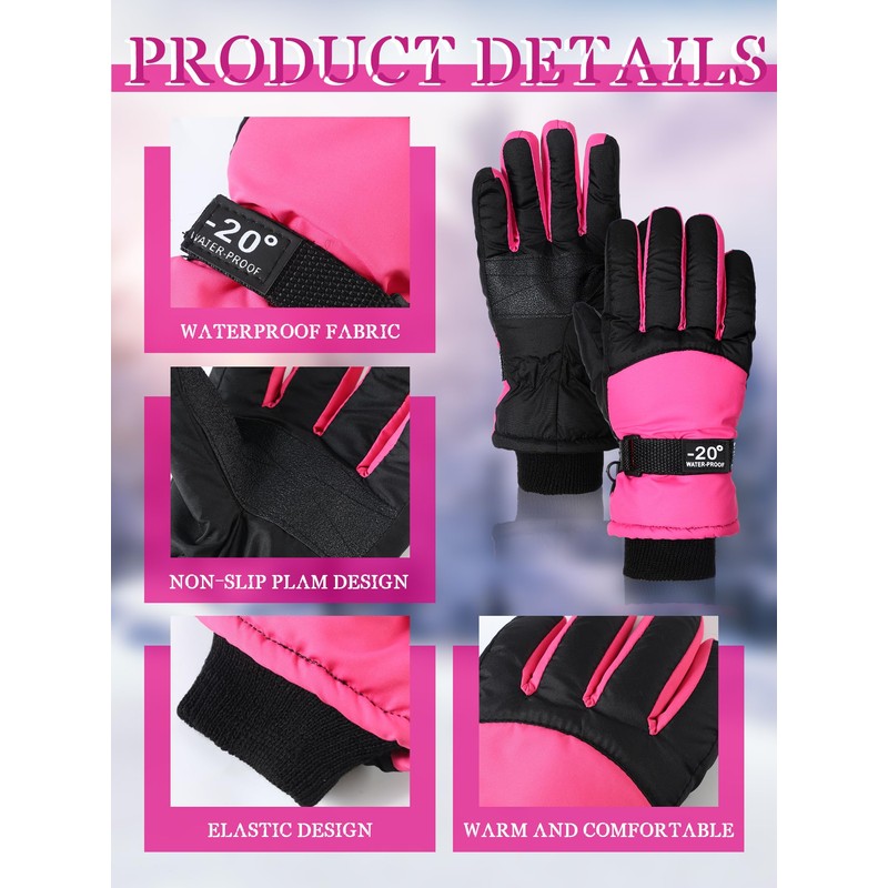 SATINIOR 2 Pares Guantes de Nieve de Invierno Impermeables para Niños Guantes de Esquí Guantes de Snowboard Gruesos Cálidos para Exteriores (Rosa Claro, Rojo Rosa, 8-12 años)