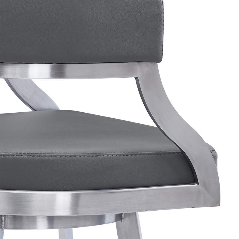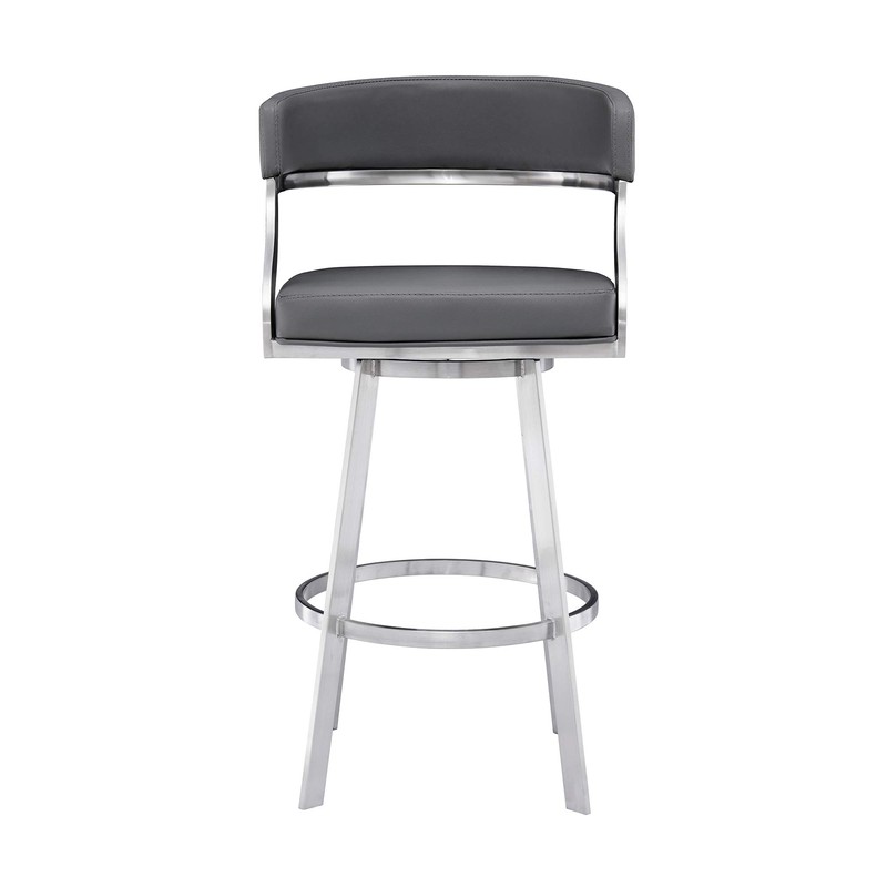 The Armen Living Saturn mid-century armless barstool is a unique addition that is certain to enhance the beauty of any modern household. Featuring a durable brushed stainless steel frame design, the Saturn assures durability without compromising on aesthetic pleasure. The Saturn’s plush grey faux leather seat is foam padded and features a 360 degree swivel function, allowing for enhanced user mobility. The Saturn’s unique low back features an upholstered top and offers excellent lumbar support. The straight led design of this unique barstool includes a round footrest and floor protectors, assuring that the Saturn will not slip on or scratch hardwood or tile floors when moved. The elegant Saturn is available in your choice of Grey or Black Faux Leather, both color options come in two industry standard sizes; 26 inch counter and 30 inch bar height