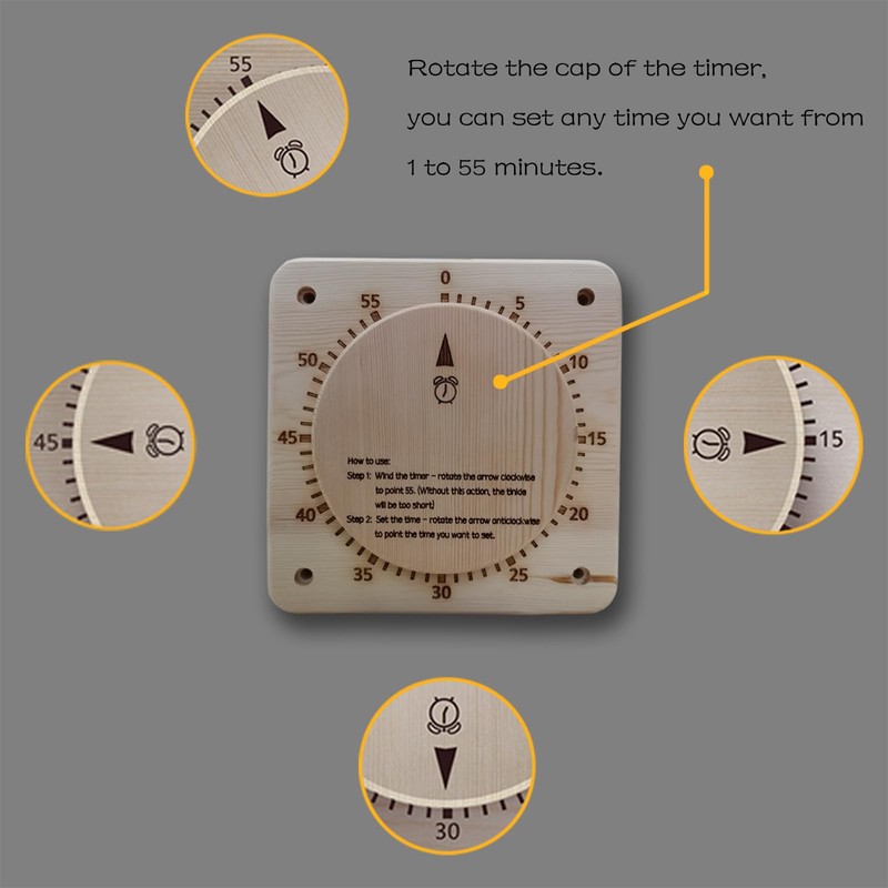 - [MAXIMUM 55 MINUTES]: Break free from the confines of a mere fifteen minutes dictated by a regular sand timer. This timer allows you to close your eyes, relish your chosen sauna relaxation, and still be alerted when the time is up. Forget about keeping tabs on the clock; this timer ensures you never overstay or cut your session short.