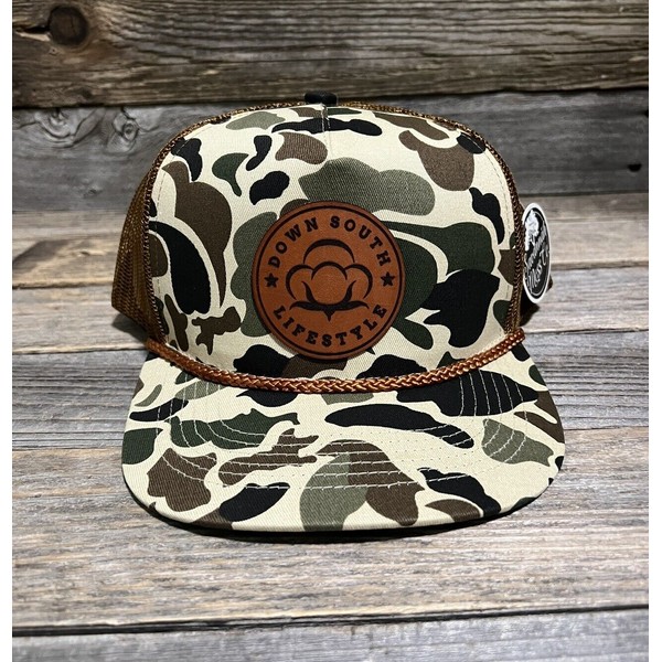 Down South Lifestyle Cotton Leather Patch Retro Duck Camo Copper Rope Snapback Hat.