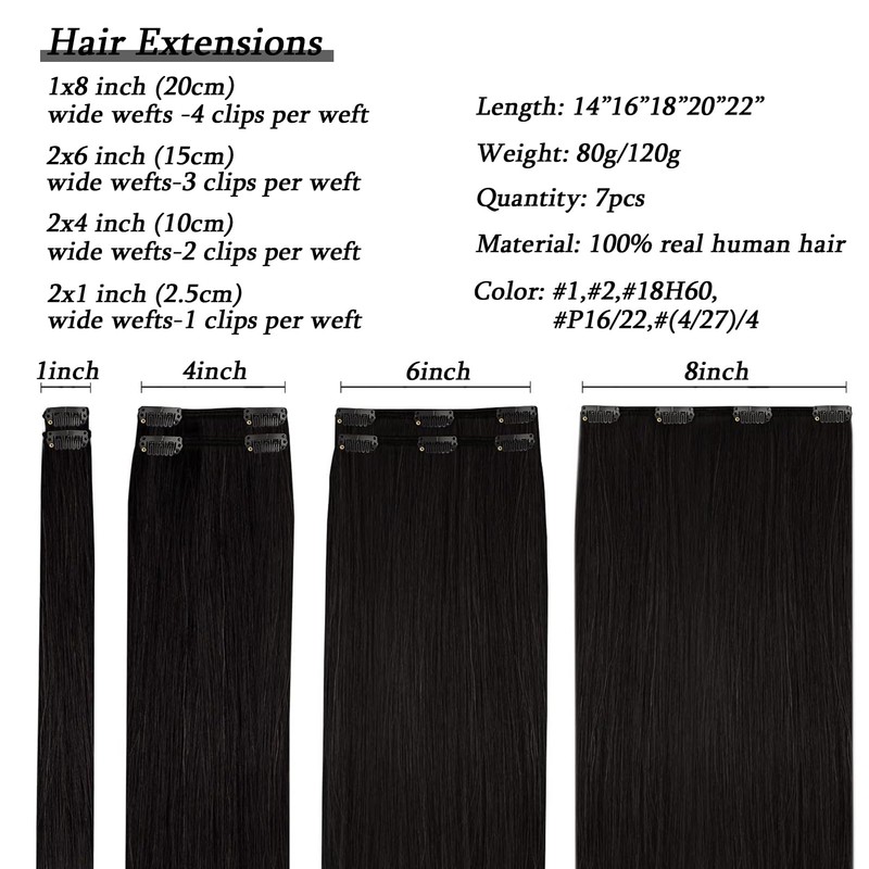 - 【Only 5 Minutes to Wear】One of the biggest advantages of black real hair extensions is how easy and quick they are to wear. With just 5 minutes, you can effortlessly add volume and length to your own hair. The clip-in system is designed for everyone to use, regardless of their hairstyling skills. Each pack comes with 7 different width pieces and a total of 16 clips, allowing you to customize the placement of hair clip in full head according to your needs.