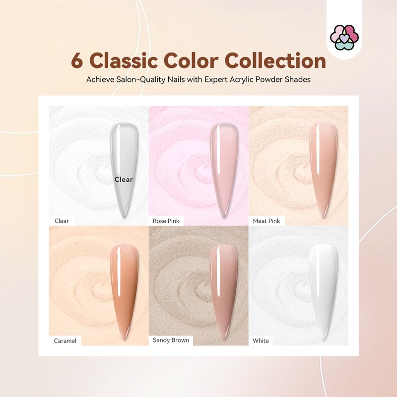 - 【Professional Acrylic Powder Set】The set features 6 classic color acrylic powders, including clear/pink/ nude nail powder, shades which offers classic appeal and 28+ days long-lasting high shine, perfect for creating versatile nail designs.