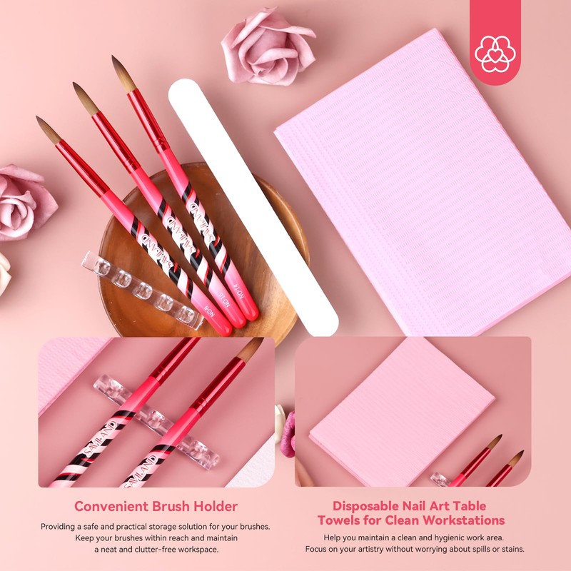 - Practical brush holder and disposable nail art table towels: We understand how important it is to keep your tools organised. That's why our brushes for acrylic nails come with brush holder and 50 pieces nail art tablecloths where the brush holder is to keep your brushes within reach, and the tablecloths are to help keep your manicure work area clean and disinfected.