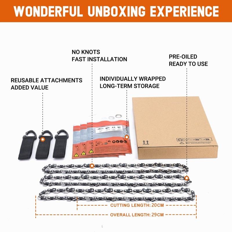 - 【HIGH QUALITY BUNDLE(3 PACK)】: Package includes: 3 x saw chains, 3 x Velcro straps (load capacity 15 kg, ideal for attaching to backpack or trolley).