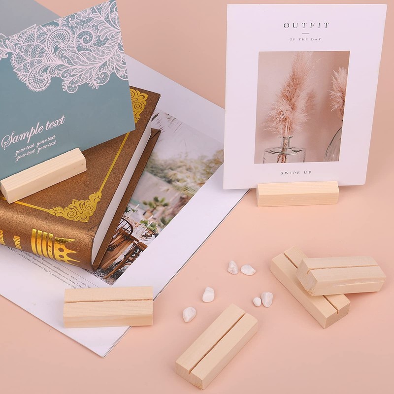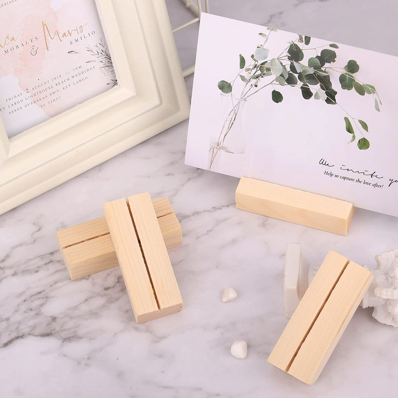 SAVITA 12 Pcs Wood Place Card Holders, Wooden Postcard Holder Acrylic Sign Stand for Party Decoration Location Small Table Menu Cards Holders Photo Display Stand