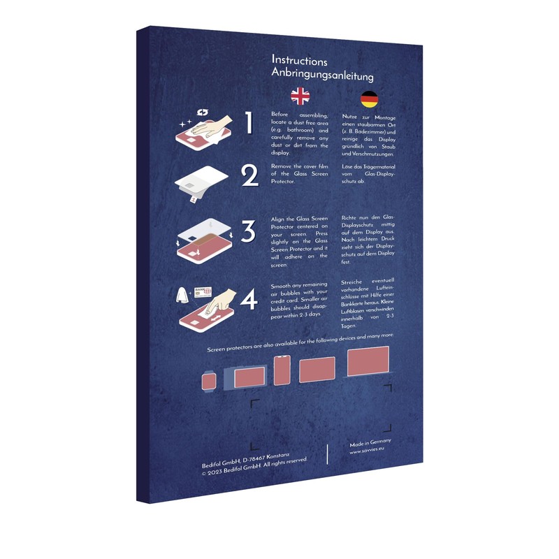 Savvies Protective glass, compatible with circular displays (diameter: 36 mm), offers maximum protection against scratches, bumps and breaks with a 9H hardness. The 99% light transmission allows a crystal clear and razor-sharp display, while the rounded edges ensure a comfortable operating experience. Our specially developed silicone adhesive layer allows for easy and bubble-free installation. The protective glass has an anti-fingerprint coating, so that dirt and fingerprints can be easily wiped away. Made by our expert team in Germany. 3 x Savvies HD33 clear protective glass compatible with circular displays (diameter: 36 mm) (3x display), alcohol cleaning cloth, microfibre cloth, adhesive strips for dust removal, installation instructions (English language not guaranteed).