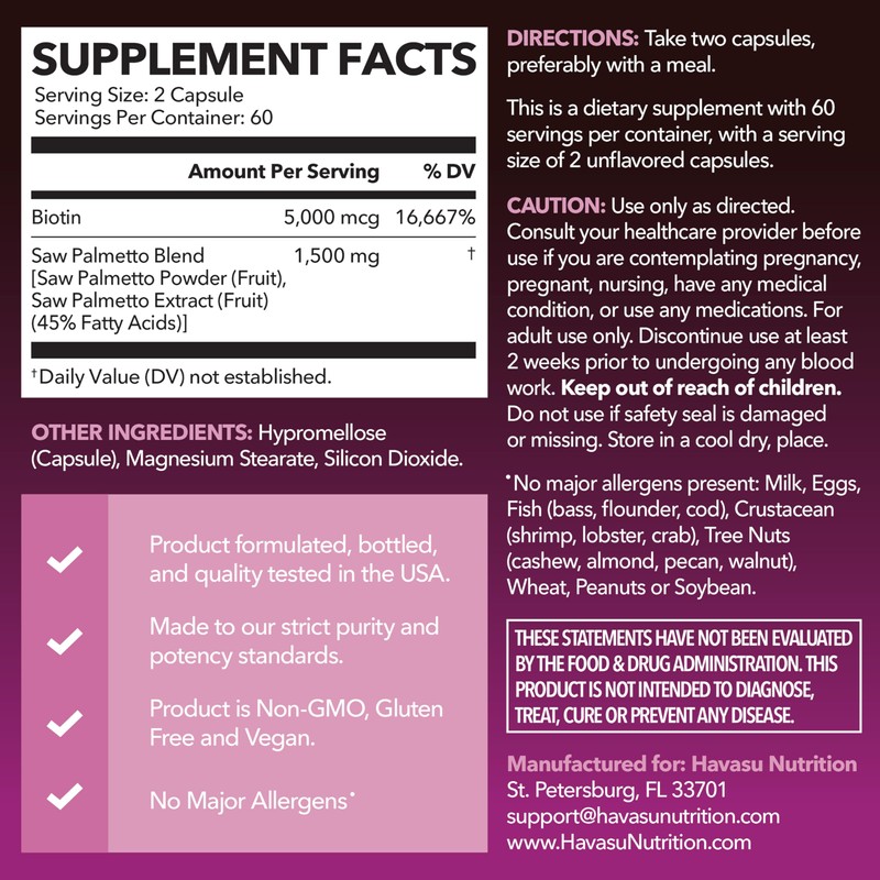 - Specifically designed for women, we took our original saw palmetto extra strength supplement and boosted it with biotin to promote hair health associated with aging. We are overjoyed to support other women in their journey as they age beautifully.